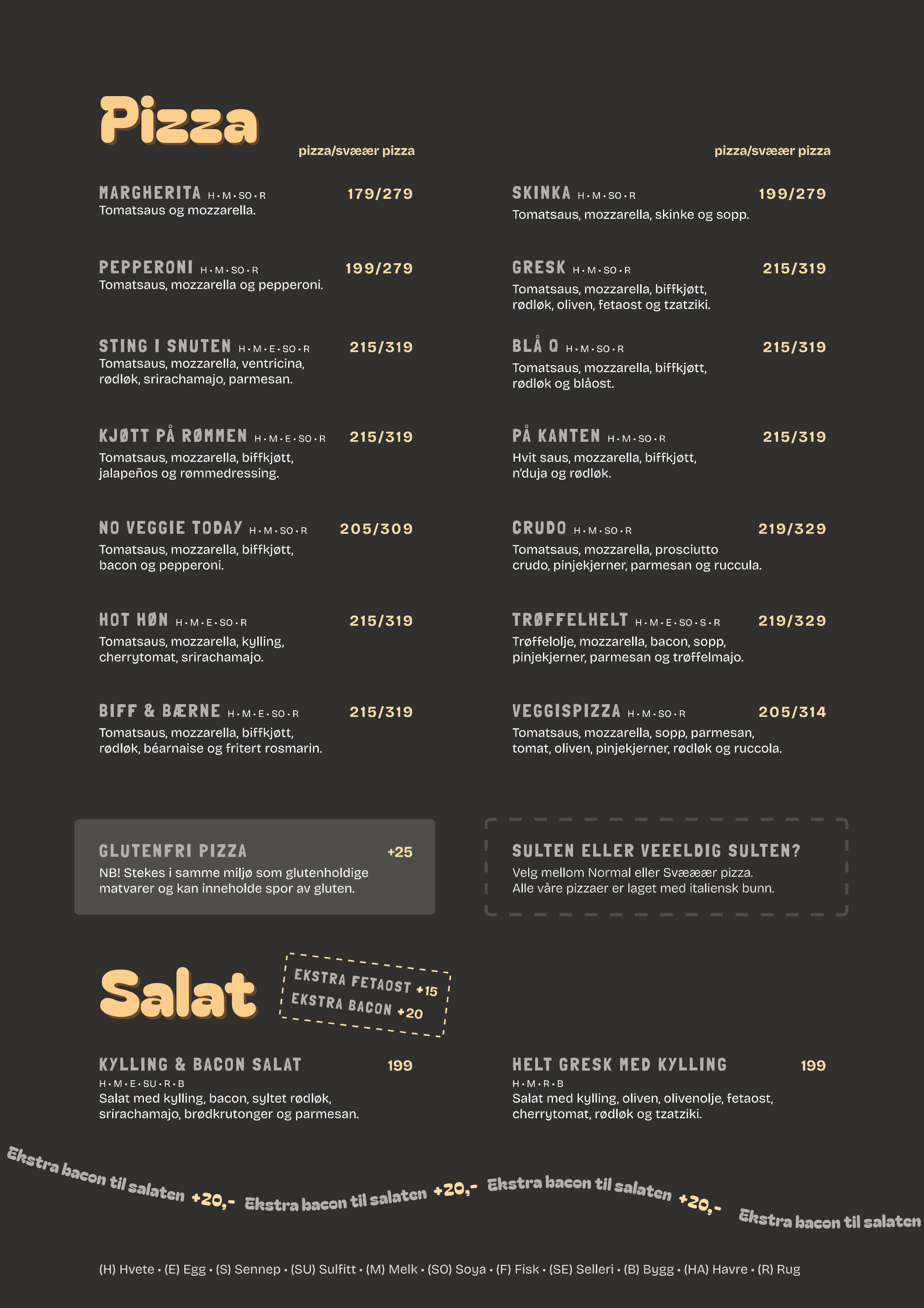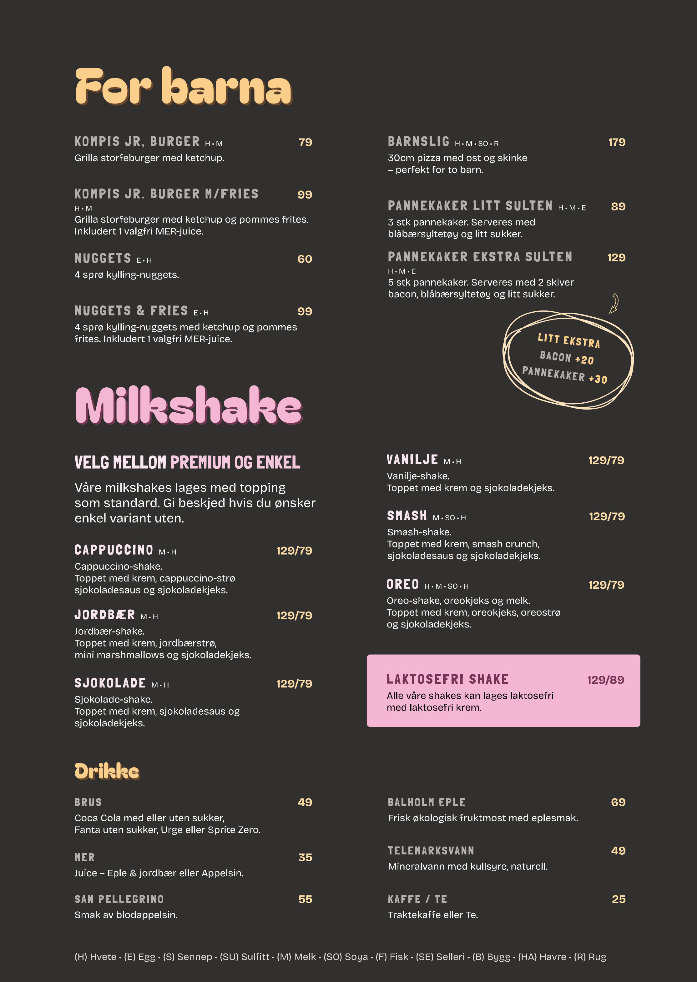 Grilla burger, italiensk pizza (Både liten og stor), de beste milkshakene og favorittmaten til kidsa! Psst... Vi har også gode, friske crispye salater😋
